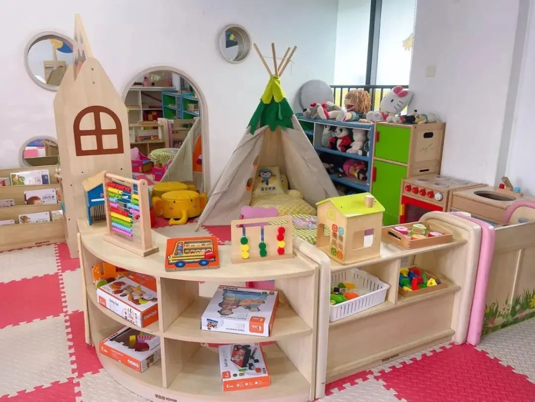 据了解,泗方托育园“宝宝屋”003号由游戏区、感统训练区、早教功能区、绘本阅读区、建构区、创意手工区组成,有两间独立教室,每间教室设有亲子洗手间。室内所有陈设布置秉持“温暖家”的理念,随处可见盖着格子画布的圆形木质书桌、马卡龙色的拼装小凳子、各种形状的小镜子、与宝贝身高相匹配的小帐篷、小靠枕、矮书柜、料理台等,细节感满分。