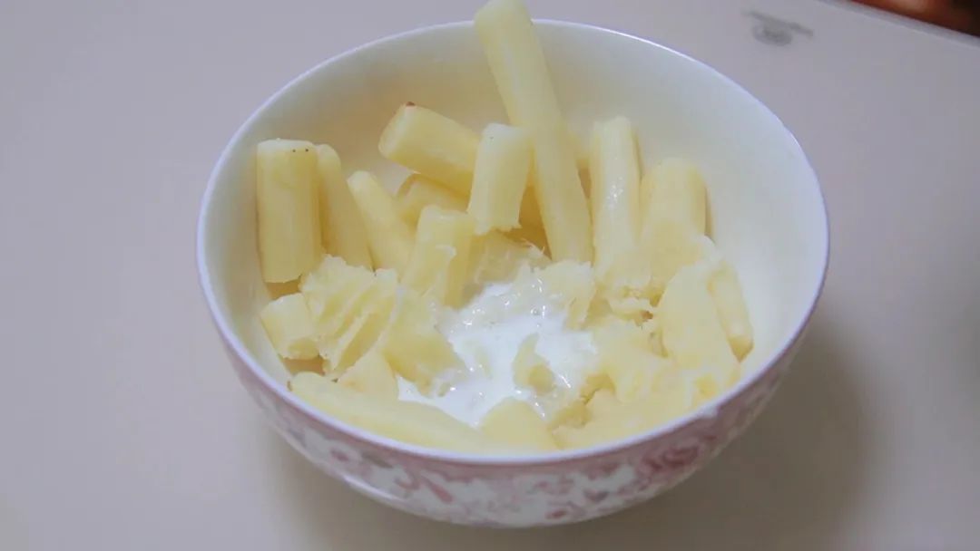 3.蒸好的山药倒入碗中,加入适量白糖、牛奶搅拌均匀