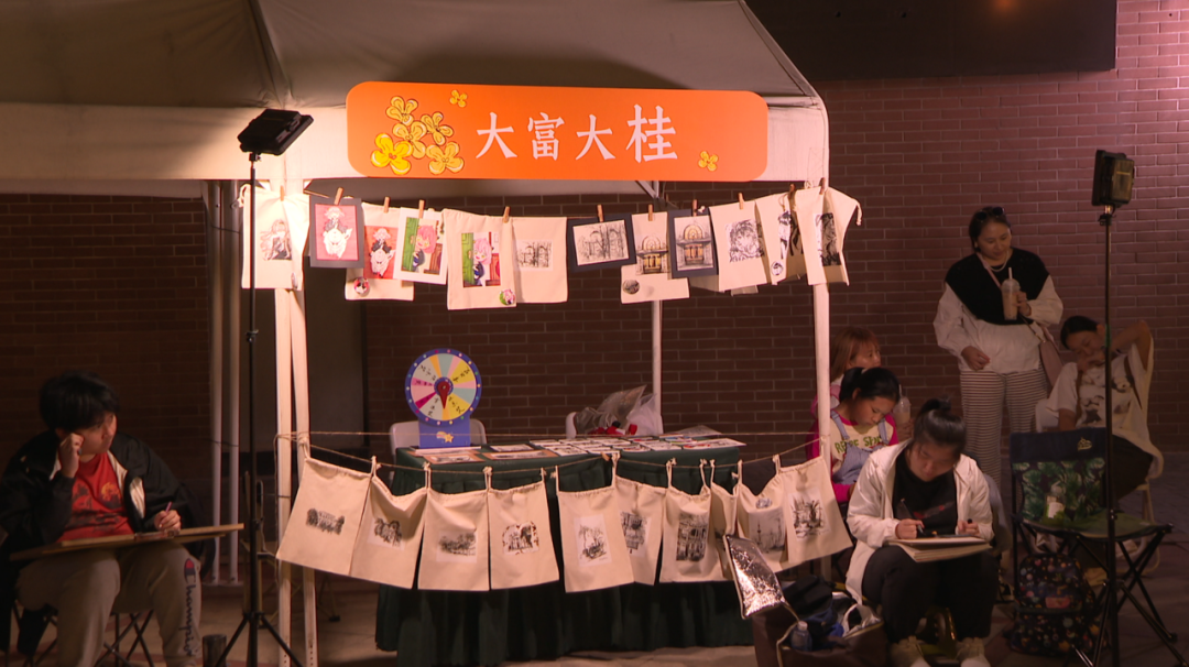而在集市的另一边,一个被绘有各式图案的帆布袋环绕的摊位格外引人注目。几名学生静静地坐在摊位旁专注作画,这份宁静与周遭的喧嚣形成鲜明对比。