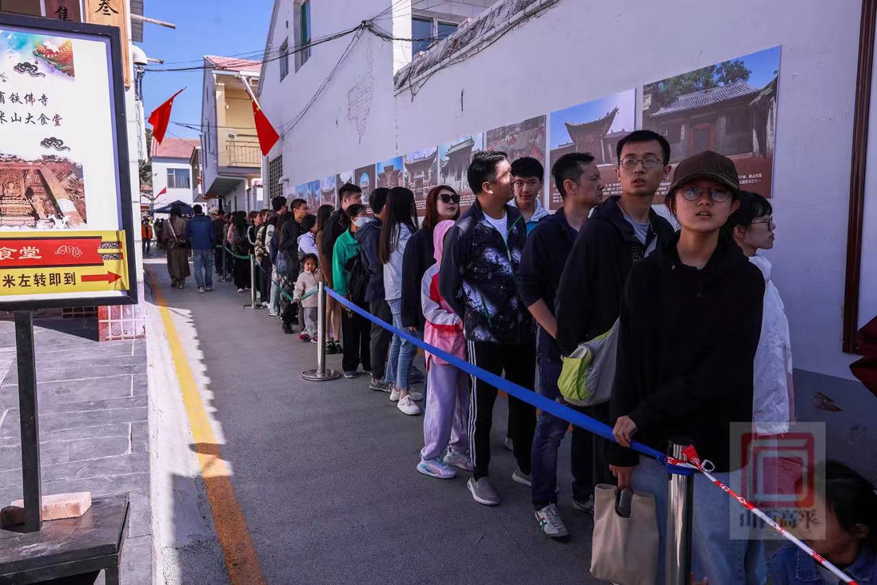 国庆黄金周期间,为丰富游客的参观体验,我市文旅局、米山镇和市文旅集团等部门,在铁佛寺周边推出了上党梆子、文艺表演“铁佛寺”文创集市土特产展区等活动,恭迎列位天命人,游客们排起长队赏国保、品国粹打卡《黑神话:悟空》取景地。