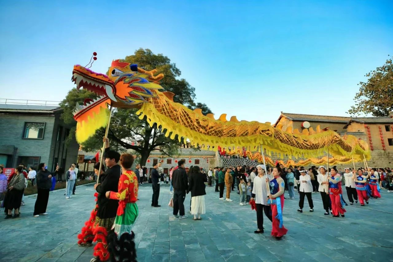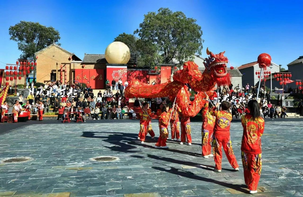 在乐火北庄,由流连非遗文化产业有限公司制作的长达69米的巨龙亮相现场,还有舞龙、九莲灯跑旱船等社火表演,游客们沉浸式观非遗、看表演。