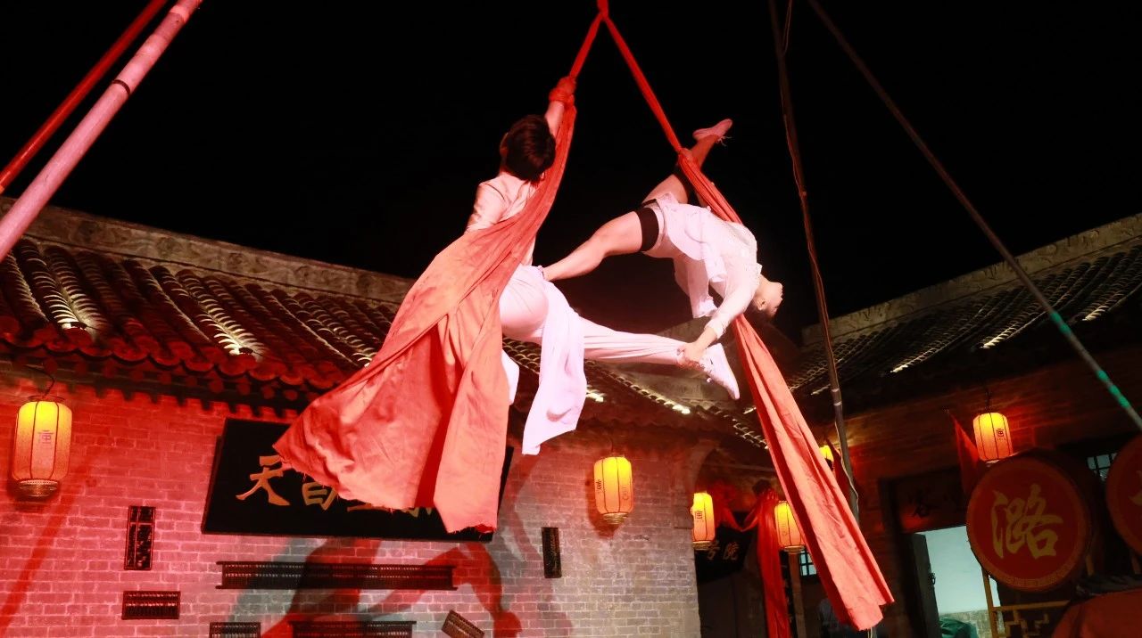 杂技、舞狮、抬花轿、踩高跷、威风锣鼓等非遗项目轮番上演,游客们近距离观赏表演,感受着非遗文化的独特魅力。磨坊招兵、醋香知味、酒肆风波、尺布惊鸿、油坊解案等情景剧表演好戏连连,游客们尽情参与其中,与角色互动,感受剧情的魅力。还有射箭、投壶、拓碑、制陶等传统游戏项目供游客体验,让游客沉浸式地感受历史和厚重文明,让单纯的放松旅游有了满满文化味。