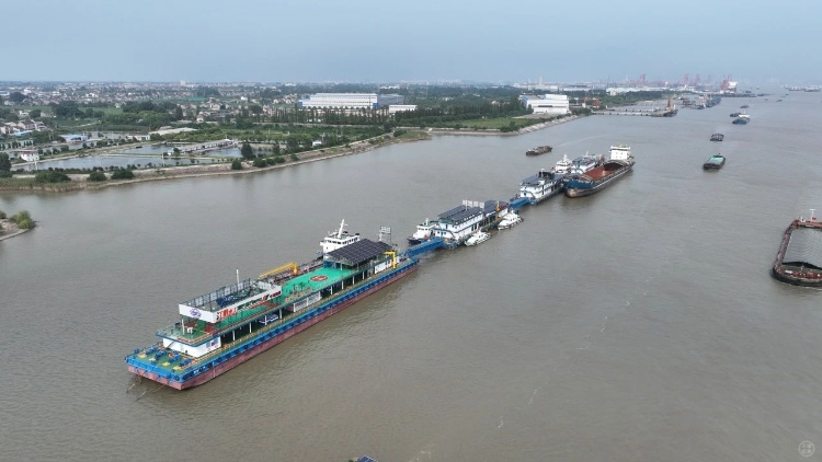 近年来,江阴港进出船舶数量不断刷新。全力推动航运高质量发展的过程中,建设绿色航运通道和升级水上配套服务成为重中之重。作为航运央企排头兵,中远海运旗下中国船燃锚定绿色低碳和数字智能“双赛道”,推出了全国首个长江碳中和水上服务区“样板”。在现场可以看到,服务区由4条油趸船组成,总长360米,可同时保障5条万吨级船舶供油服务。