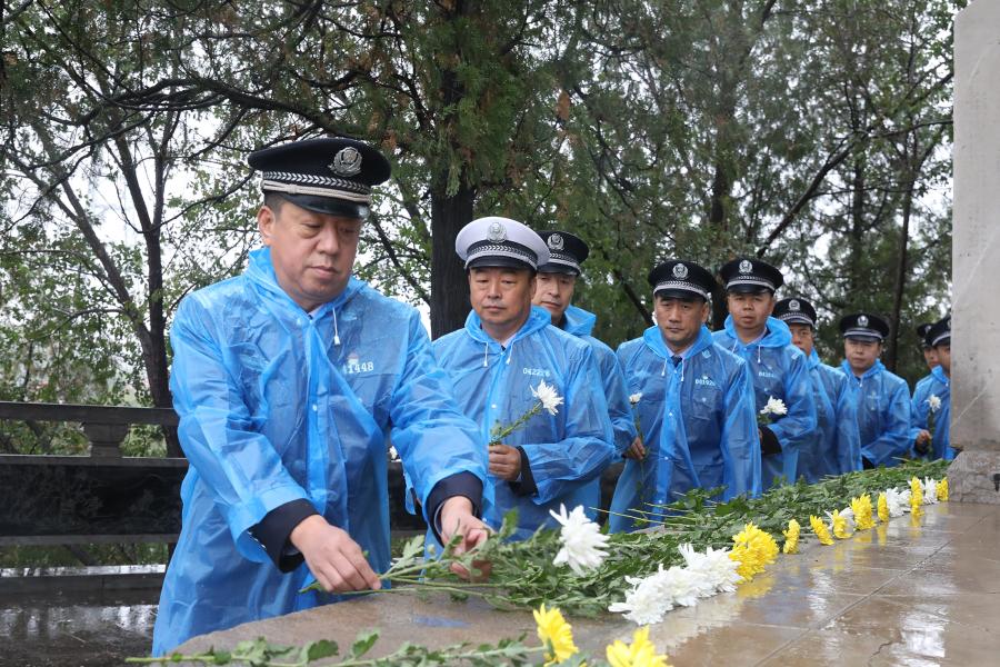 伴随着深情的《献花曲》,八名公安干警稳稳抬起花篮,缓缓走向纪念塔,将满载哀思与崇敬的花篮整齐地摆放在纪念塔前,郭强神情庄重,缓步上前,仔细整理花篮缎带。