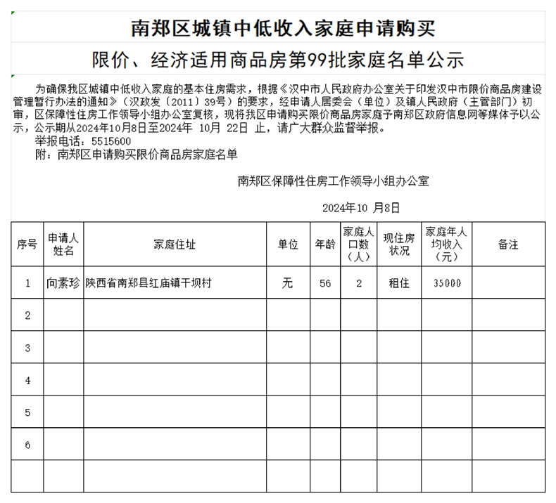 南郑区城镇中低收入家庭申请购买限价、经济适用商品房第99批家庭名单公示