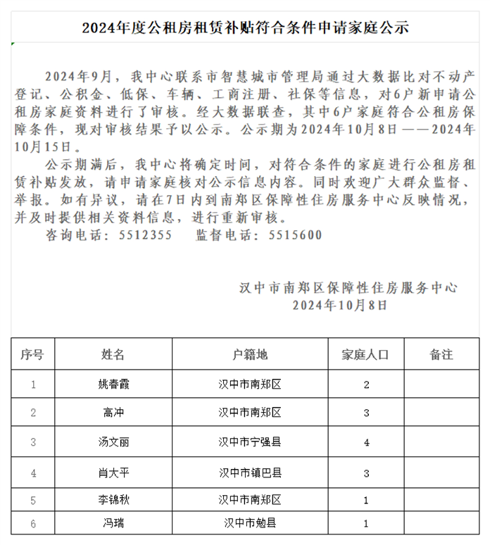 2024年度公租房租赁补贴符合条件申请家庭公示