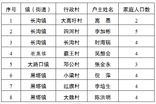 根据健全防止返贫动态监测和帮扶机制工作要求,经农户申请并承诺授权、村民评议、村内公示、乡(镇)审核和县级备案等程序,确定高恩等8户 30人为监测对象。现向社会公告(名单附后)。