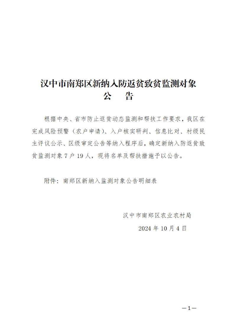 汉中市南郑区新纳入防返贫致贫监测对象公告