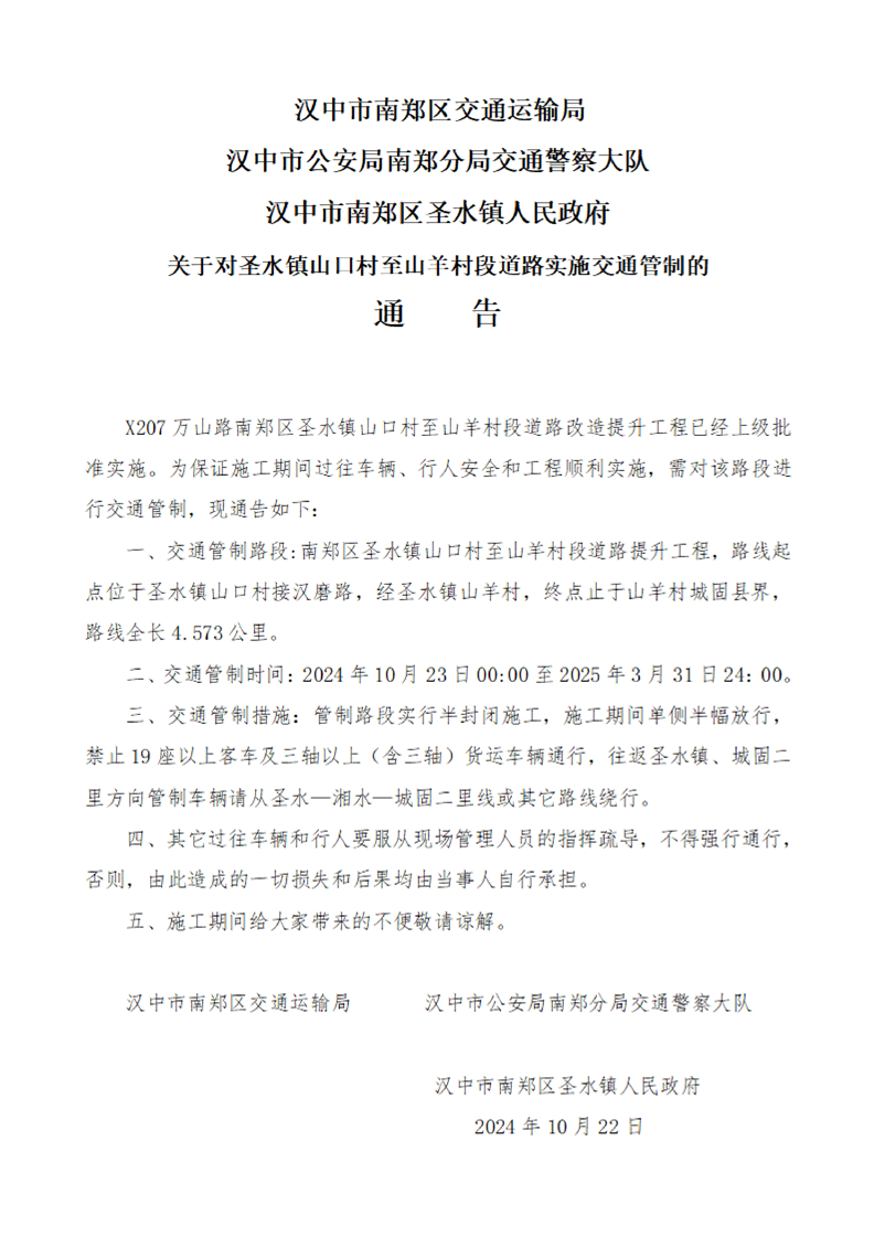 关于对圣水镇山口村至山羊村段道路实施交通管制的通告