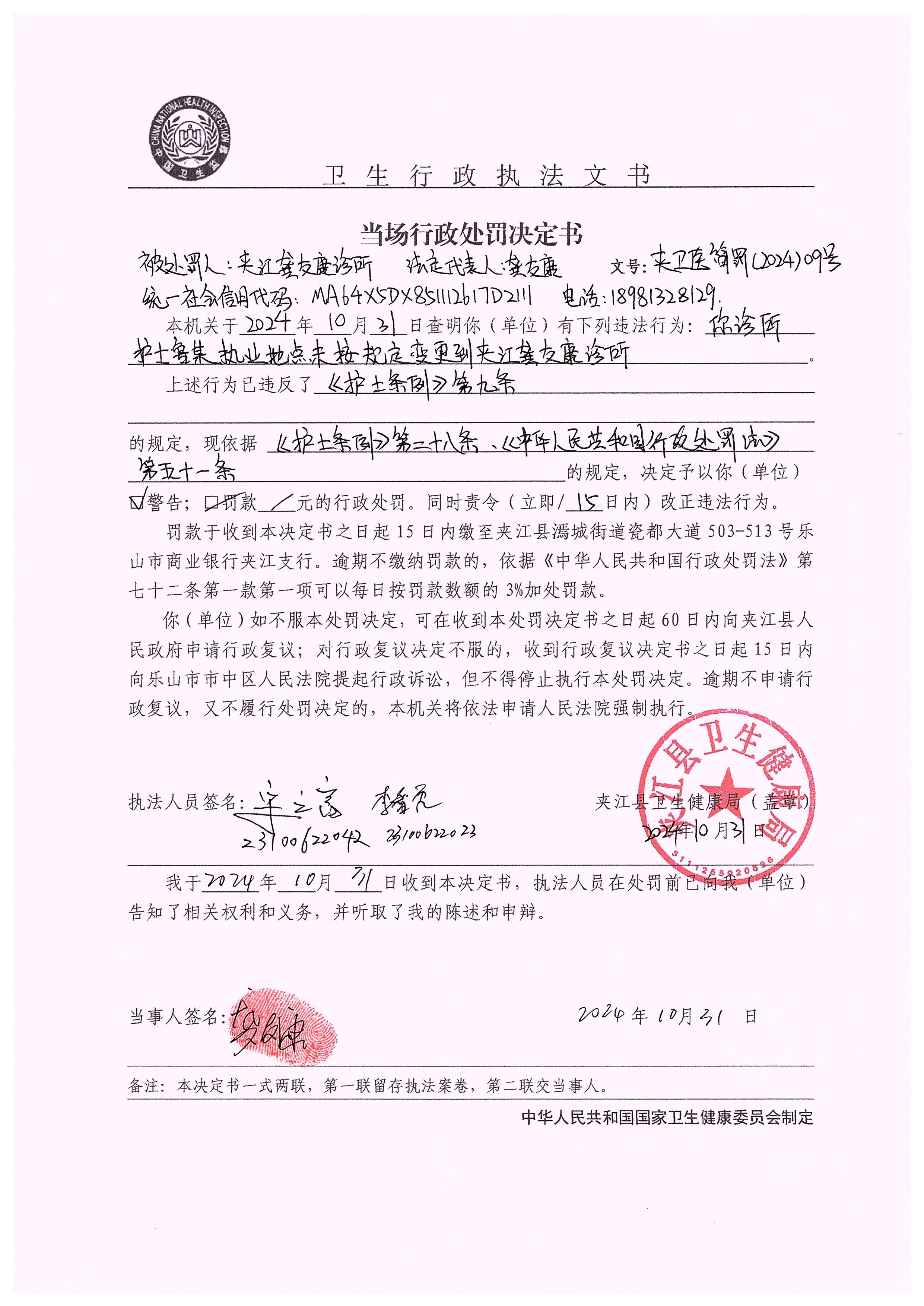 当场行政处罚决定书(龚友康诊所)