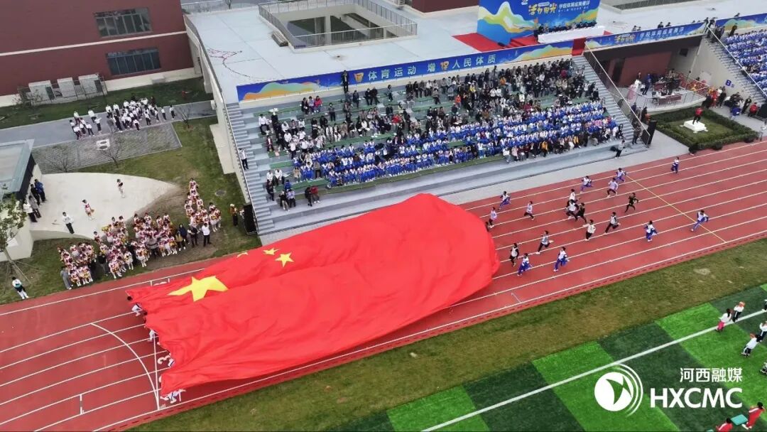 “让我们将目光转向起点处,看,来自第二新华中学的优秀学生代表,正高举着鲜艳的五星红旗奔跑而来。他们的每一步都踏出了青春的节拍,目光中充满了对祖国的热爱与敬仰……”跟随着主持人的指引,全体观众看到一面铺满8条跑道的五星红旗,如黄河般奔涌而来,最终定格在操场正中央,五星红旗前面是一条由几十位学生拉起的巨型红领巾,象征着少先队员的光荣和使命。