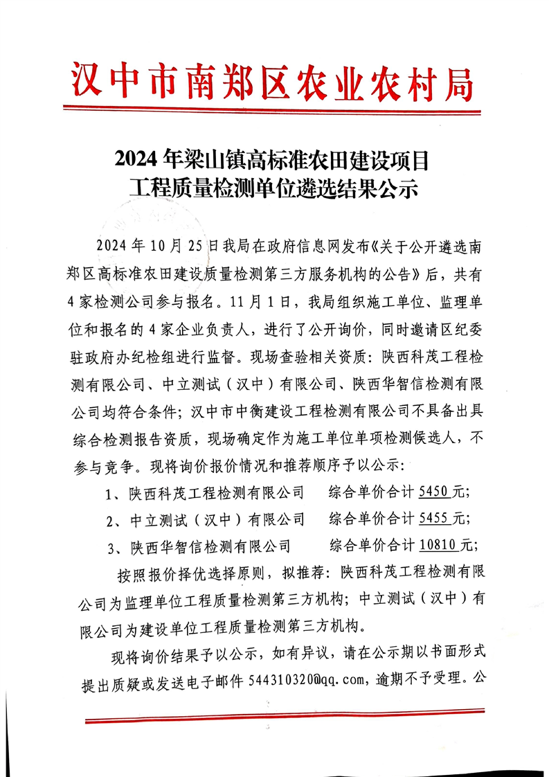 2024年梁山镇高标准农田建设项目工程质量检测单位遴选结果公示