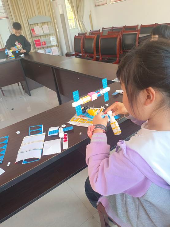 与此同时,志愿者还带领孩子们进行空间站模型搭建,孩子亲自动手,用剪纸、泡沫、小电机等材料,把自己的梦想注入模型之中,给自己小小梦想插上翅膀,随着空间站飞向太空。