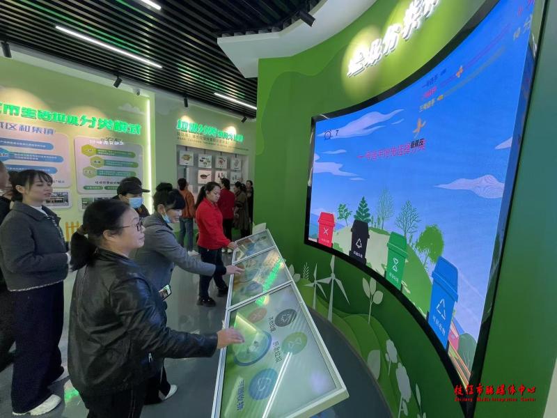 讲解员借助文字、展示品、互动游戏等,让参与人员沉浸式体验到日常生活垃圾分类的方法,呼吁大家从社会、经济、环境等角度重视垃圾分类问题,在做好居民小区环境保洁的基础上,积极开展居民小区“定时定点”垃圾分类模式,引导居民在投放点正确分类。