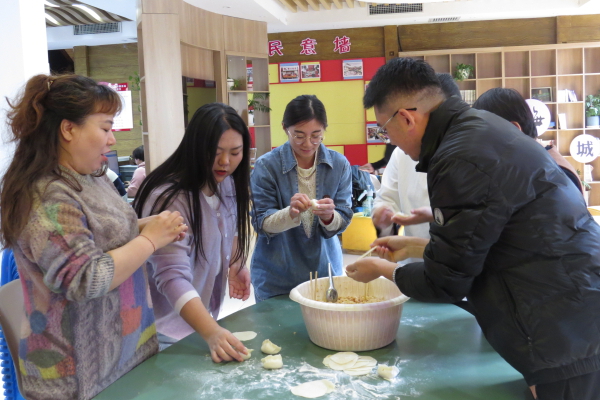 一起开始洗菜、切菜、和面、拌馅……分工明确,大家动作娴熟,一手拿起饺子皮,一手填馅,满载爱心的饺子很快便呈现出来。