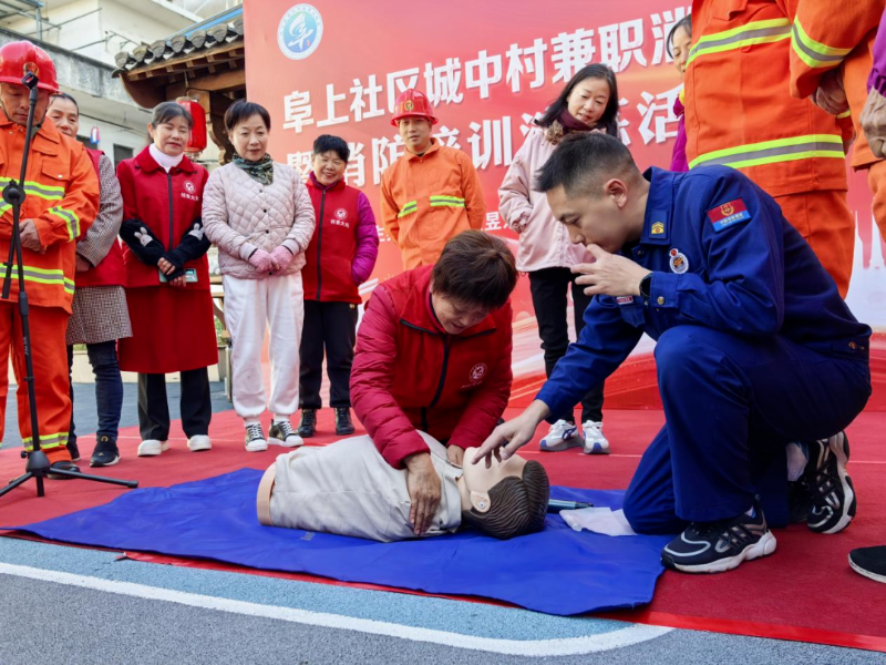 仪式结束后,一场干货满满的消防演练培训活动火热拉开帷幕,党群服务站变身“消防知识学堂”。消防培训活动邀请了老街专职消防队队长程顺富前来授课,他向居民群众详细讲解了消防灭火器的操作方法,普及CPR(心肺复苏术)急救知识。