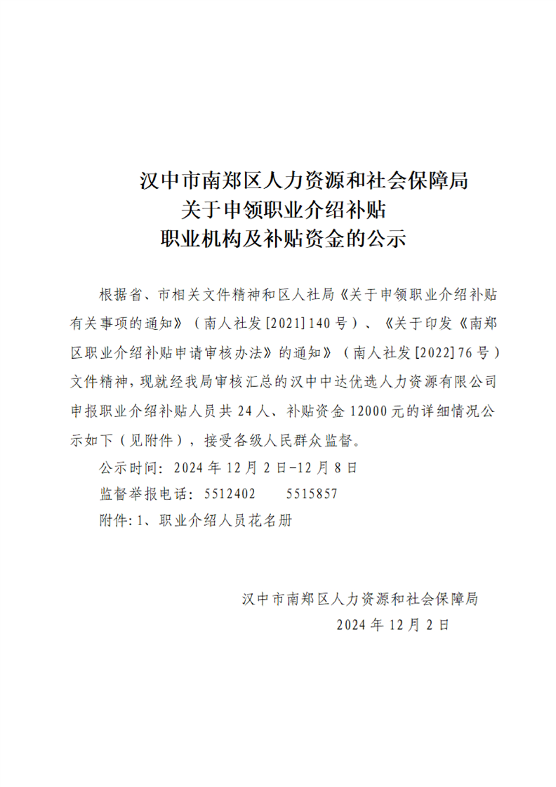 汉中市南郑区人力资源和社会保障局关于申领职业介绍补贴职业机构及补贴资金的公示