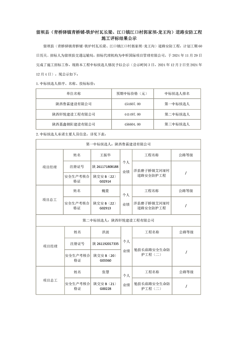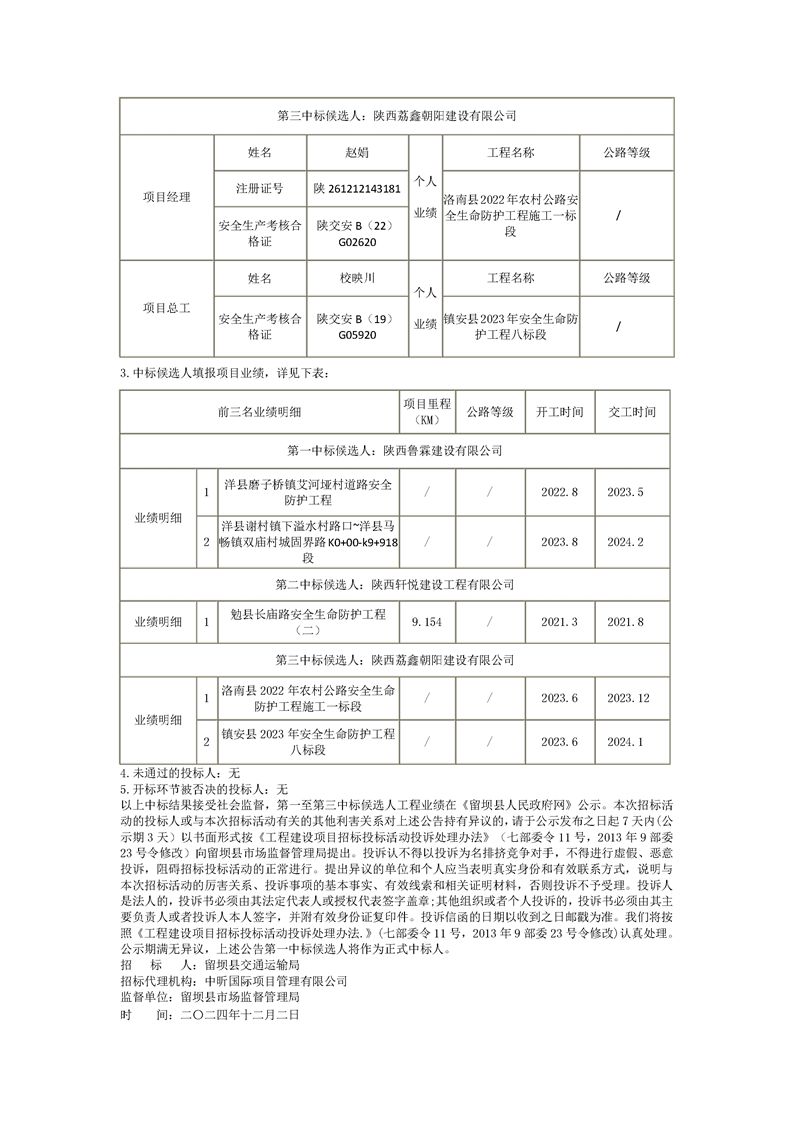 留坝县(青桥驿镇青桥铺-铁炉村瓦长梁、江口镇江口村郭家坝-龙王沟)道路安防工程施工评标结果公示