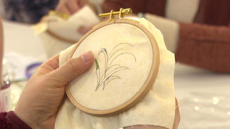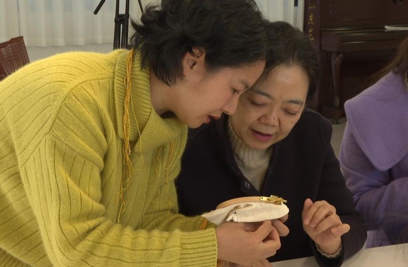 走进工作室,一堂妙趣横生的刺绣课正在进行,学员们围坐在一起手执针线,一针一线,细心专注,在老师的悉心指导下,逐渐掌握了走针、切线等刺绣技巧。绣布上,一幅幅金黄的稻穗悄然绽放,栩栩如生,现场音乐声、笑声不断。