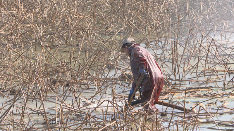 藕塘表面看似一片寂静,实则在水下蕴藏着勃勃生机。采藕工人们分布在藕田各处,熟练地寻找莲藕的位置,在水下一顿摸索,确定整段莲藕的走势和长度后,他们借助高压水枪,冲刷周围的淤泥,将一根根肥硕饱满、色泽洁白的冬藕从水下挖出,犹如冬日里的珍珠,映衬出这个季节特有的丰饶与生机。