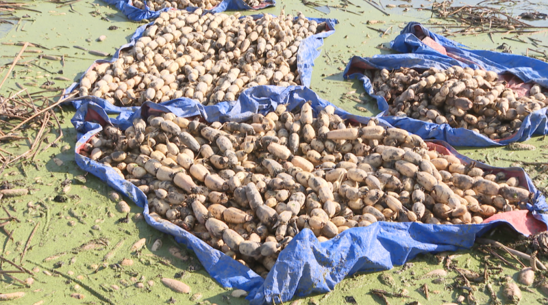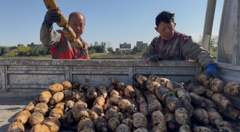 挖藕工人们手法娴熟,小心翼翼地将莲藕挖出,将其放在蓝色的布上。不一会儿,岸边的蓝布上便摆满了刚出土的莲藕,这些莲藕带着新鲜的泥土气息,条条饱满。接着,工人再将藕分拣到篮子里,用扁担挑起装满藕的篮子,称重、装车,运往各地市场,让鲜嫩、可口、富有营养的莲藕走进千家万户。