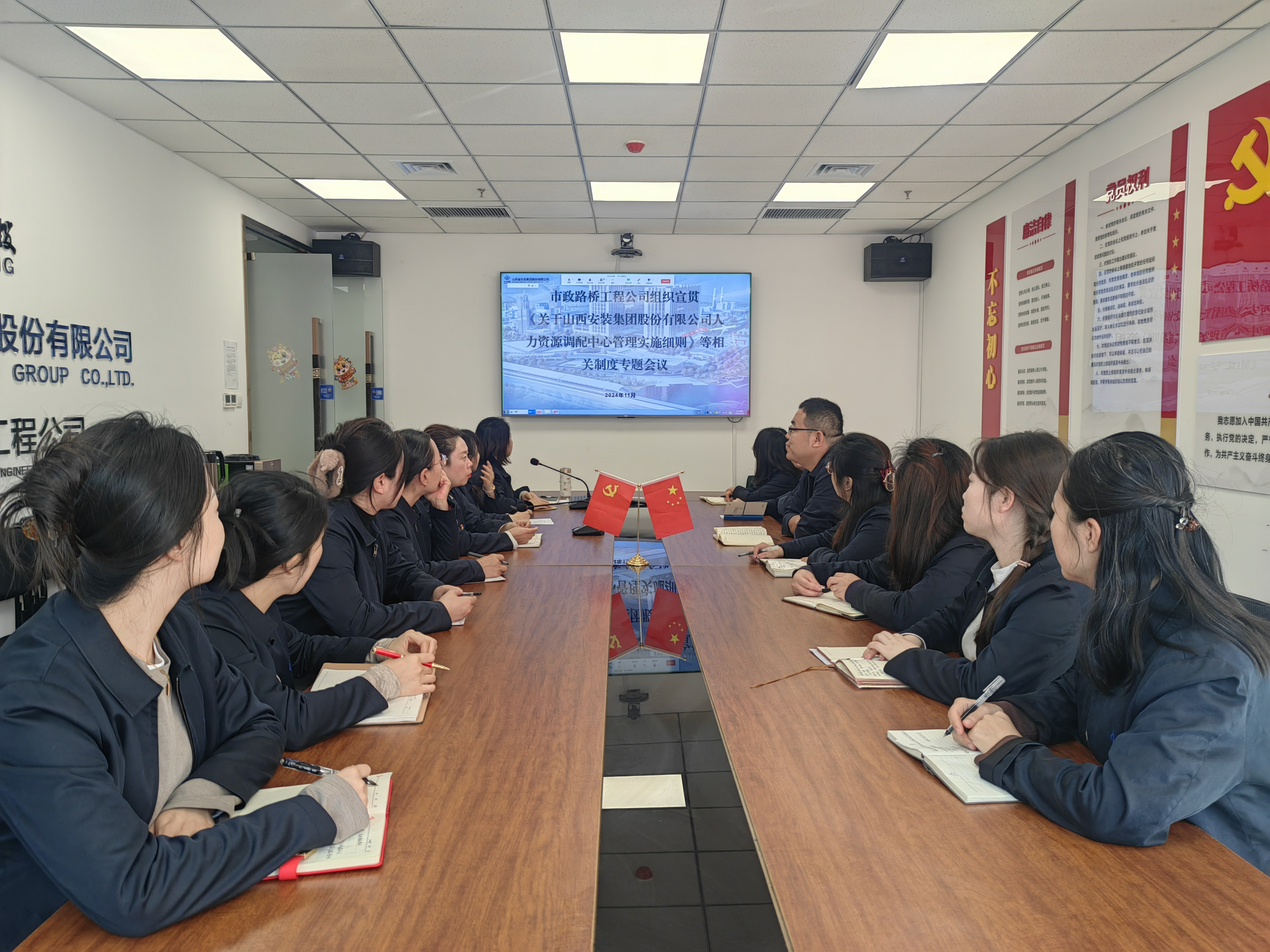 11月25日,市政路桥工程公司组织宣贯集团《人力资源调配中心管理实施细则(试行)》专题会,会议以“现场+视频”的形式召开,工程公司全体职工参加。