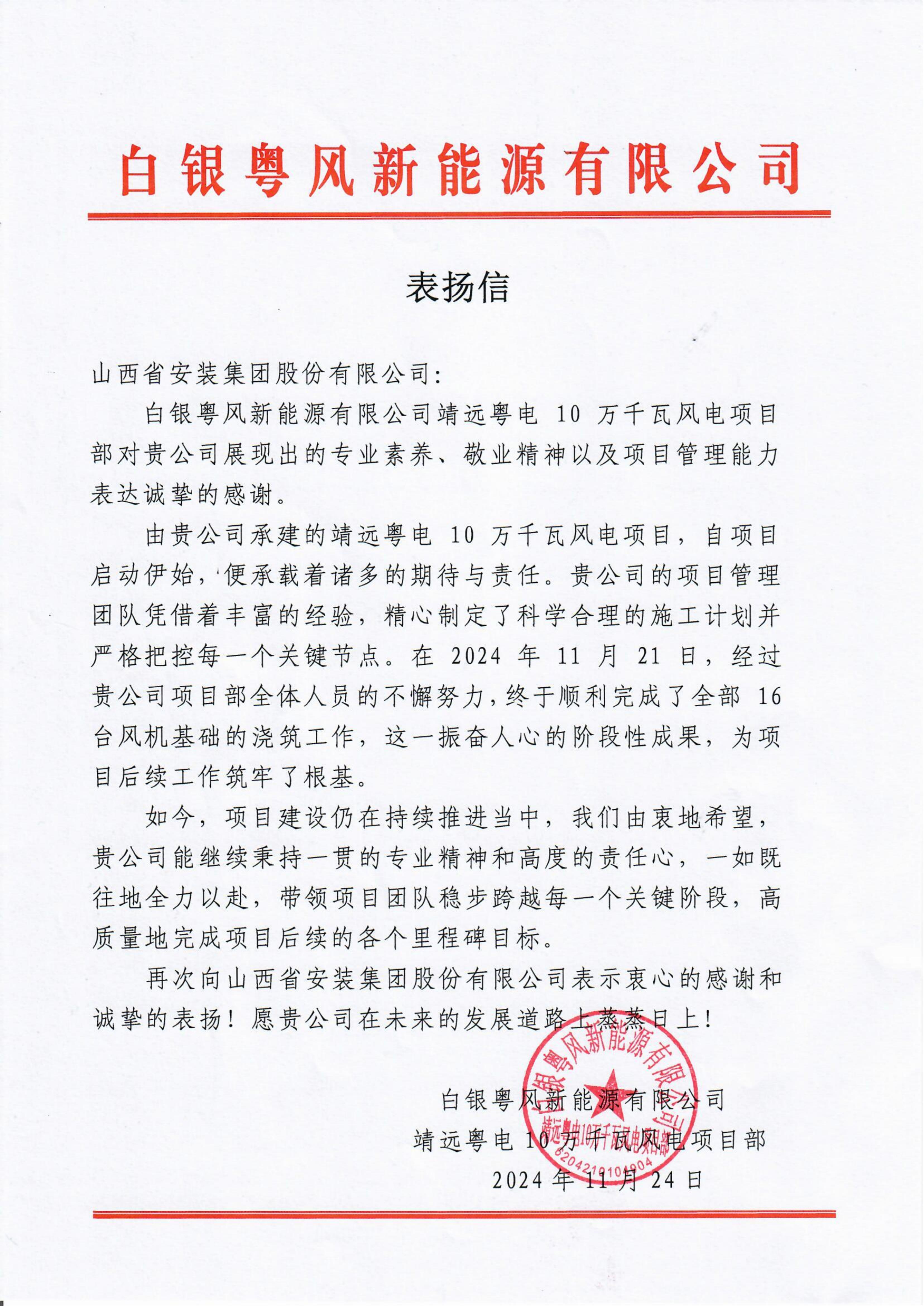 西北工程公司靖远粤电10万千瓦风电项目获业主表扬信