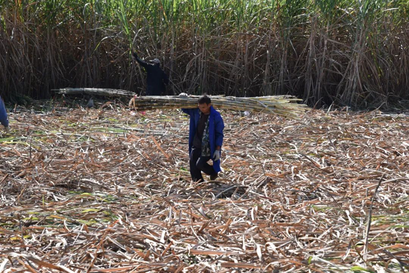 由于砍甘蔗需要大量人工,村委会还请了一些空闲在家的村民和贵州的砍蔗团队来负责砍甘蔗。田间地头,工人们挥舞着手里的工具,砍、捆、扛、运……忙得不亦乐乎。