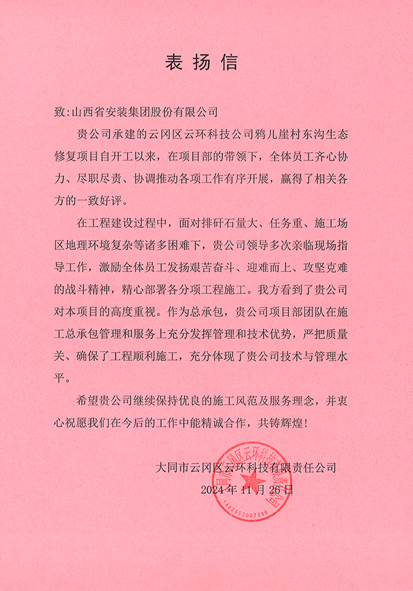 11月26日,由第四工程公司承建的云冈区云环科技公司鸦儿崖村东沟生态修复项目收到了来自业主表扬信,信中对项目管理团队实施过程中的专业精神、高效管理以及过硬的工程质量给予了充分肯定。