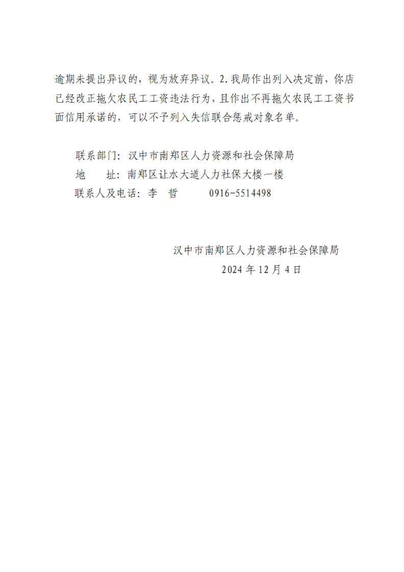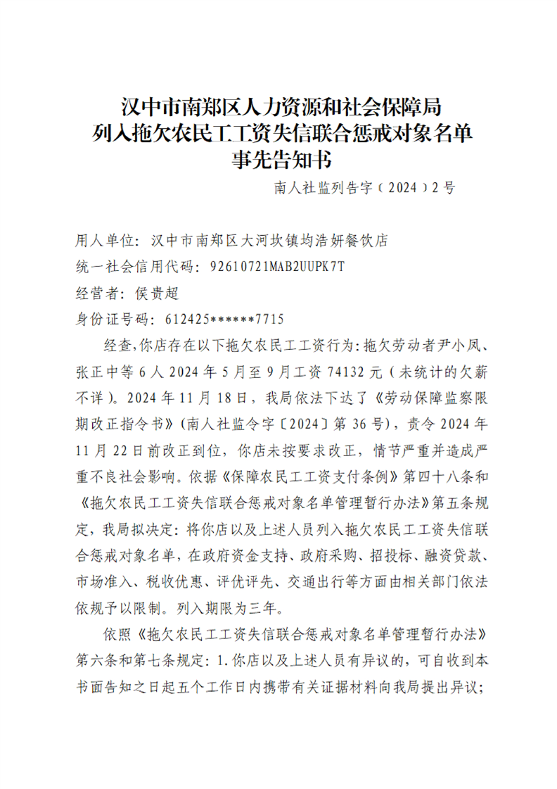 汉中市南郑区人力资源和社会保障局列入拖欠农民工工资失信联合惩戒对象名单事先告知书