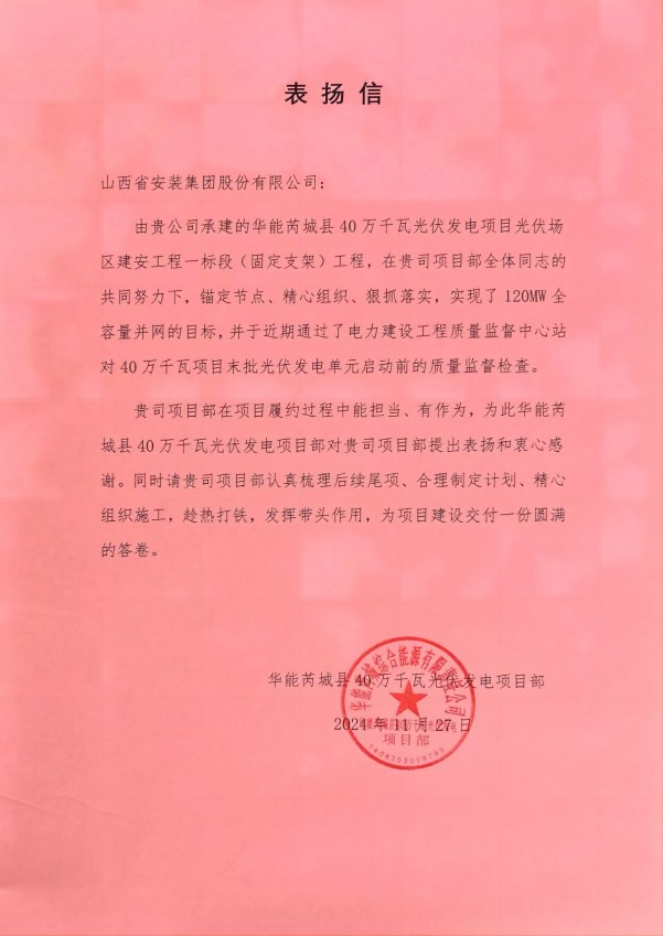 11月27日,第四工程公司华能芮城县40万千瓦光伏发电项目再次收到华能山西综合能源有限责任公司的表扬信,信中业主对项目实现120MW全容量并网表示祝贺。