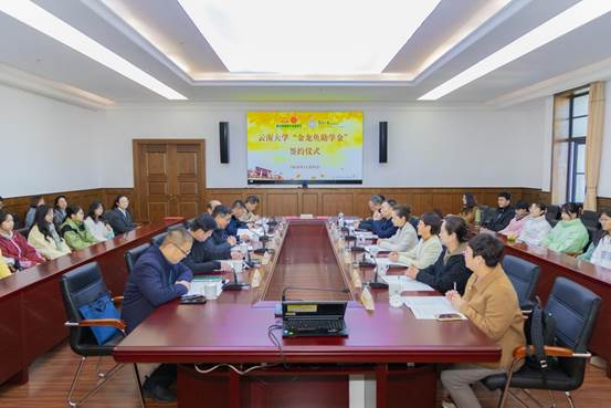 2024年12月3日,云南大学“金龙鱼助学金”签约仪式在呈贡校区举行。省侨联副主席万妍娟,省侨联副主席、昆明市侨联党组书记、主席尹朝晖,益海嘉里(昆明)食品工业有限公司总经理张良文,云南大学副校长陈克清,学工部、教育基金会、有关学院负责人,以及受助学生参加活动。校党委统战部部长高小秦主持签约仪式。