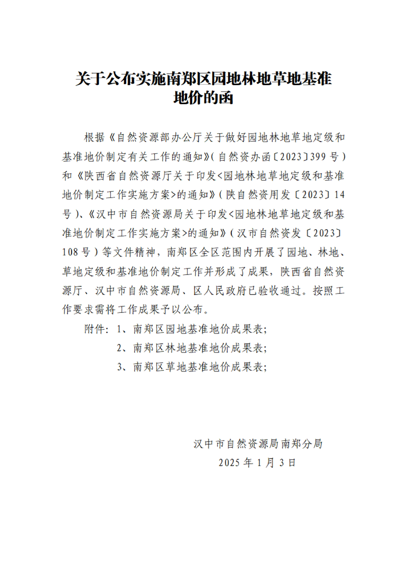 关于公布实施南郑区园地林地草地基准地价的函