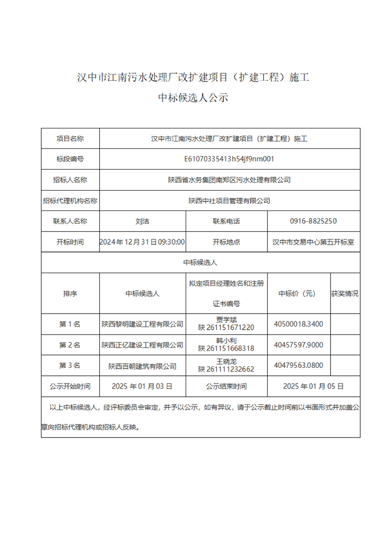 汉中市江南污水处理厂改扩建项目(扩建工程)施工中标候选人公示