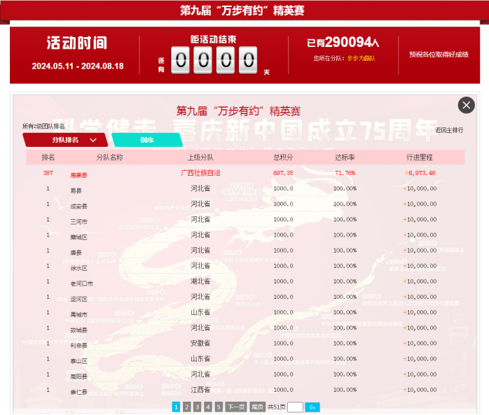 (一)全国共有683个县区参加万步精英赛,我县最终排名第387名。详见数据截图: