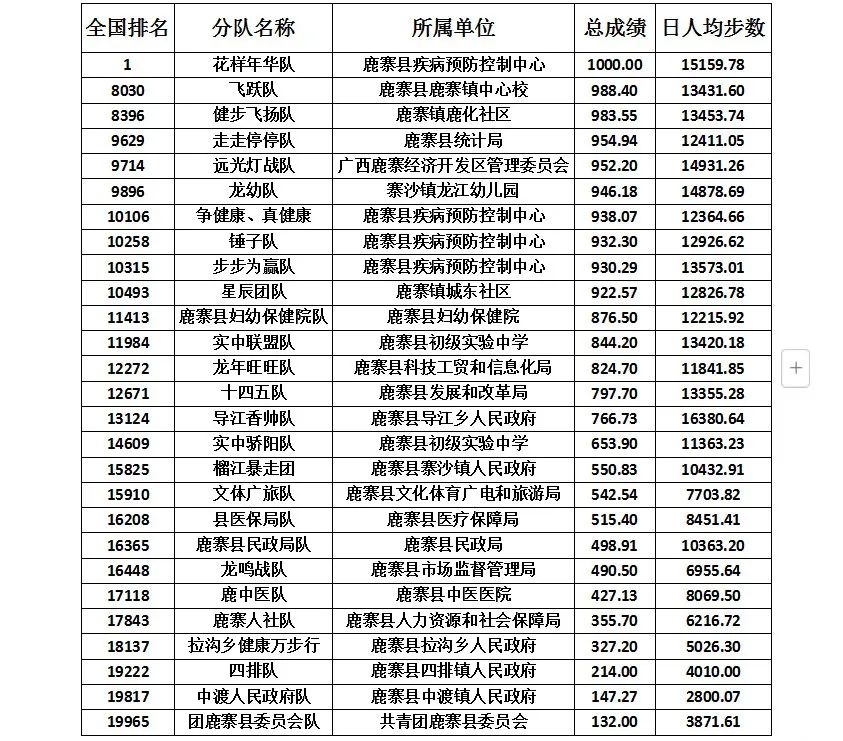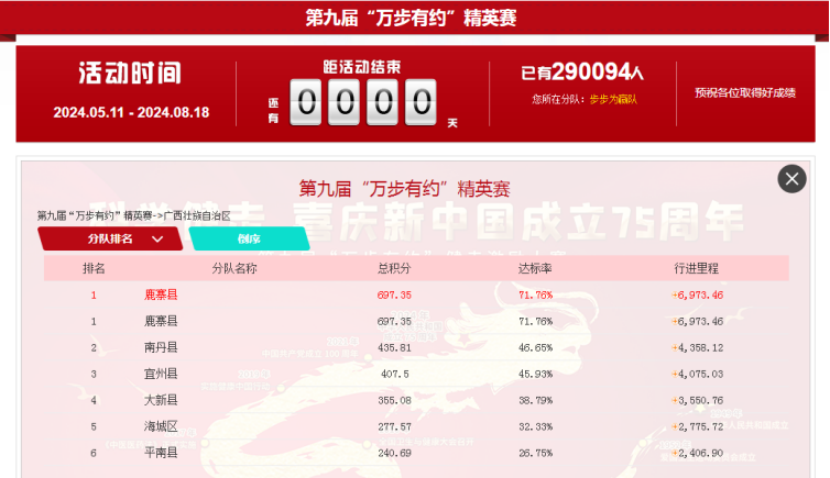 (二)广西共有6个县区参加万步精英赛,我县排名第1名,详见数据截图: