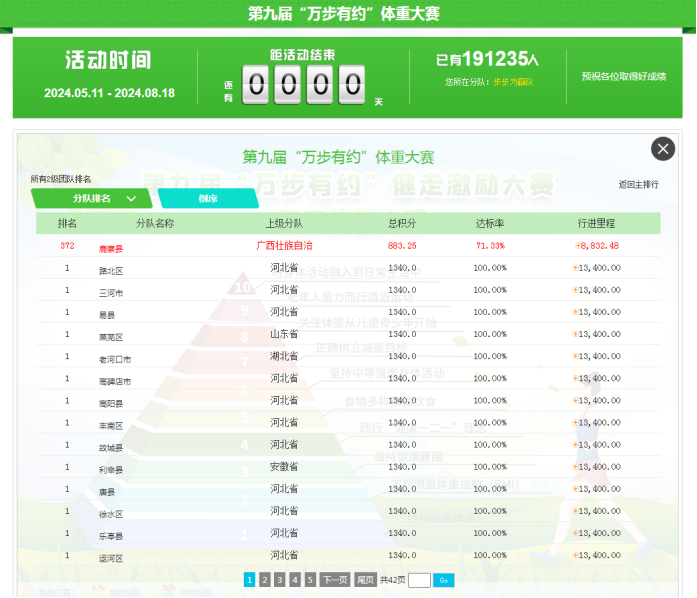 (一)全国共有583个县区参加万步体重大赛,我县最终排名第372名,详见数据截图: