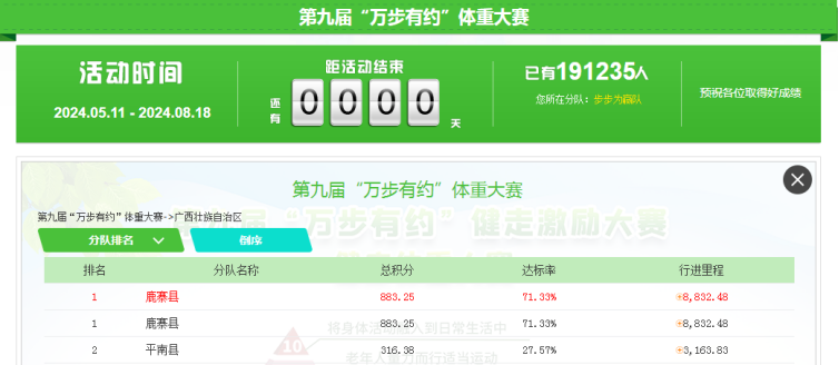 (二)广西共有2个县区参加万步体重大赛,我县排名第1名,详见数据截图: