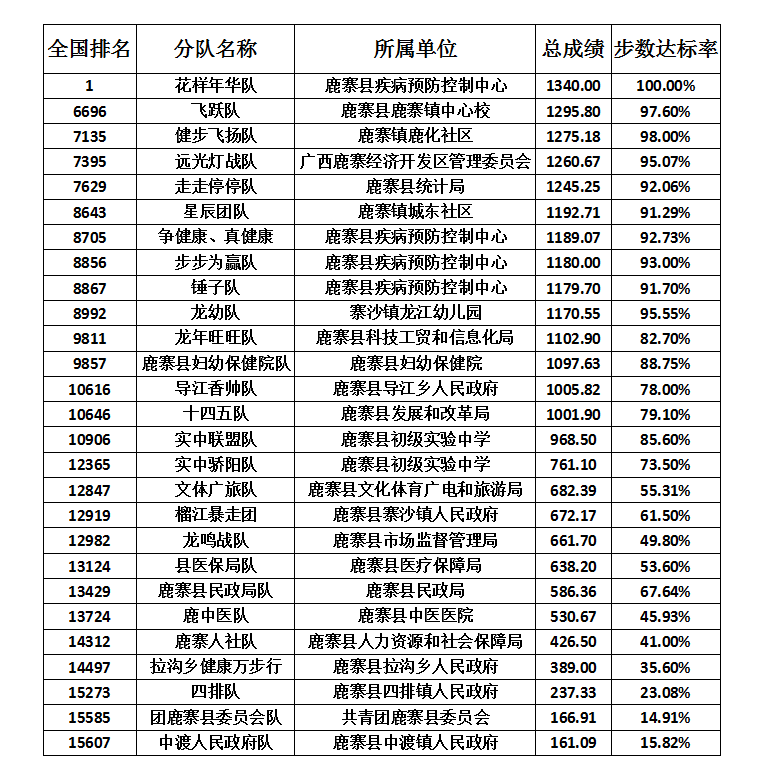 全国第九届“万步有约”健走激励大奖赛暨鹿寨县第五届“健康万步行”大赛已完满结束,经过100天的激烈角逐,通过全体队员的坚持努力,我县在广西赛区取得了第一名的优异成绩。