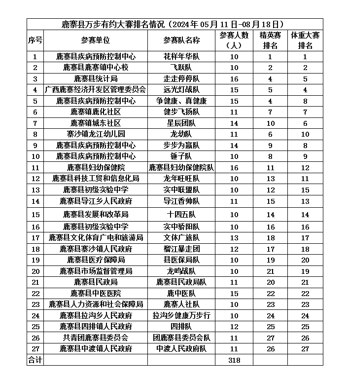 体重大赛前5名排名分别为:鹿寨县疾病预防控制中心队伍(花样年华队)、鹿寨县鹿寨镇中心校(飞跃队)、鹿寨镇鹿化社区(健步飞扬队)、广西鹿寨经济开发区管理委员会(远光灯战队)、鹿寨县统计局(走走停停队)。