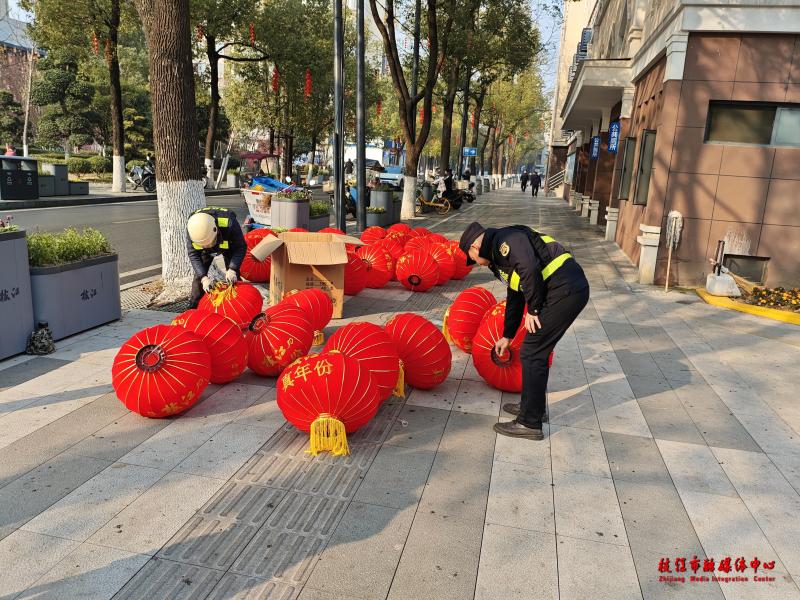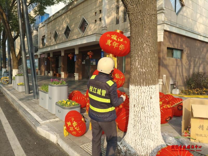 为顺利给枝江千家万户点亮万家灯火,让归乡过年的亲人们感受到家乡的温暖,市城管执法局每天出动工作人员20余人,工程车辆6台,紧锣密鼓地在我市大街小巷、公园广场等地方的行道树、路灯杆上悬挂大红灯笼,烘托出浓浓节日氛围,灯笼布置工作将于1月中旬全部完成。今年共计布置植绒六连灯笼5000串,PVC五连灯笼2845串,PVC三连灯笼3255串,三连挂大红灯笼310套,单个大红灯笼2886套,各类造型灯笼总计61646个。
