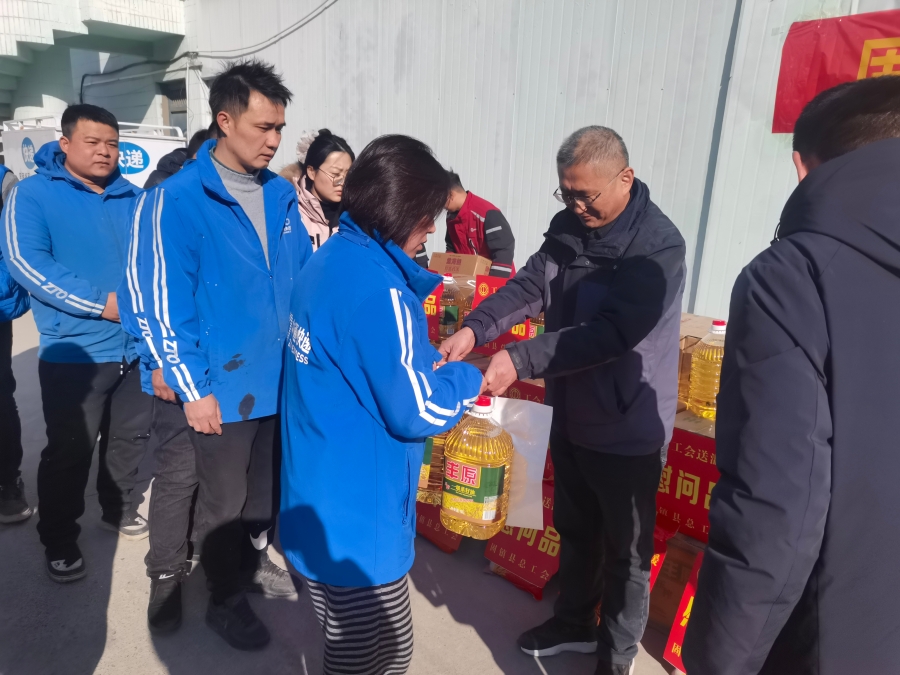 元月10日下午,县委社会工作部、县总工会、县商务局一行来到物流园区,为奋战在一线的180余名新业态劳动者送上大米、食用油等生活物资,传递来自“娘家人”的关心关爱。