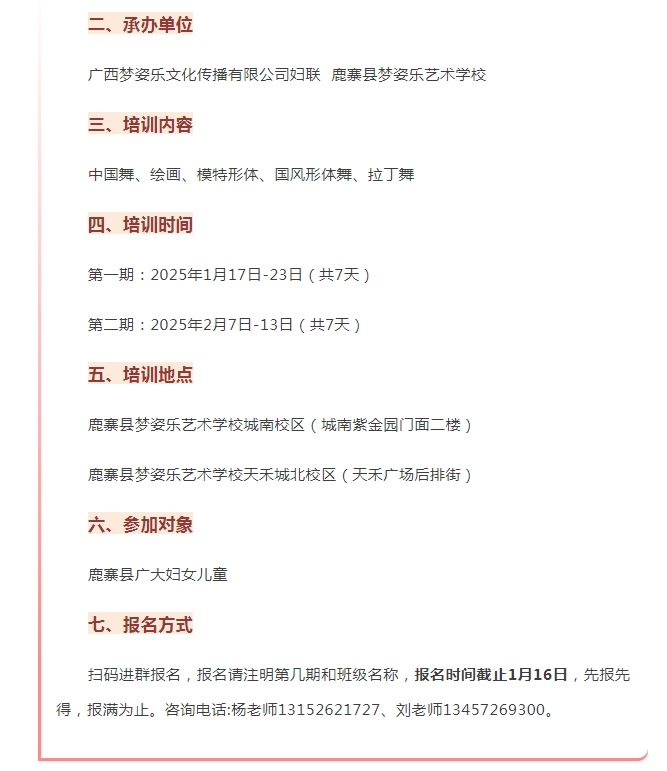 为提升我县广大妇女儿童的综合素质与艺术修养,鹿寨县妇联、鹿寨镇妇联联合广西梦姿乐文化传播有限公司妇联、鹿寨县梦姿乐艺术学校,将开展系列寒假公益培训班。
