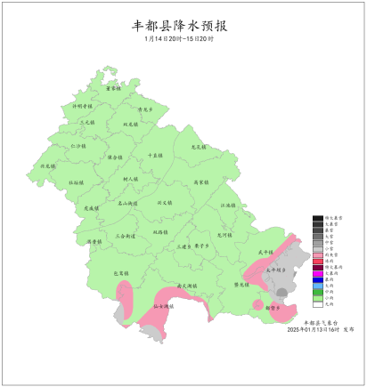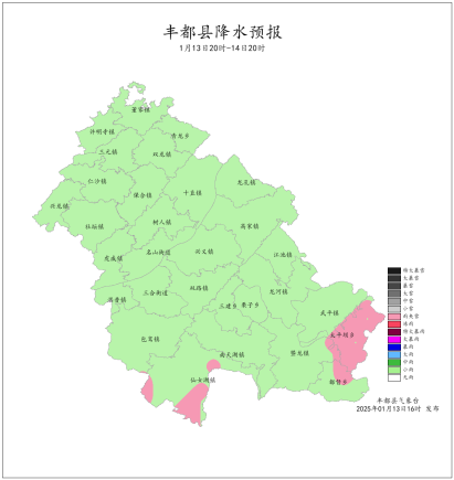 2025年1月12日16时至1月13日16时我县多云转阴天。极大风速13.6米/秒(南天湖景区,12日17时),最低气温-0.7~9.2℃,最高气温2.4~17.4℃。丰都国家基本站最低气温8.1℃,最高气温11.1℃。
