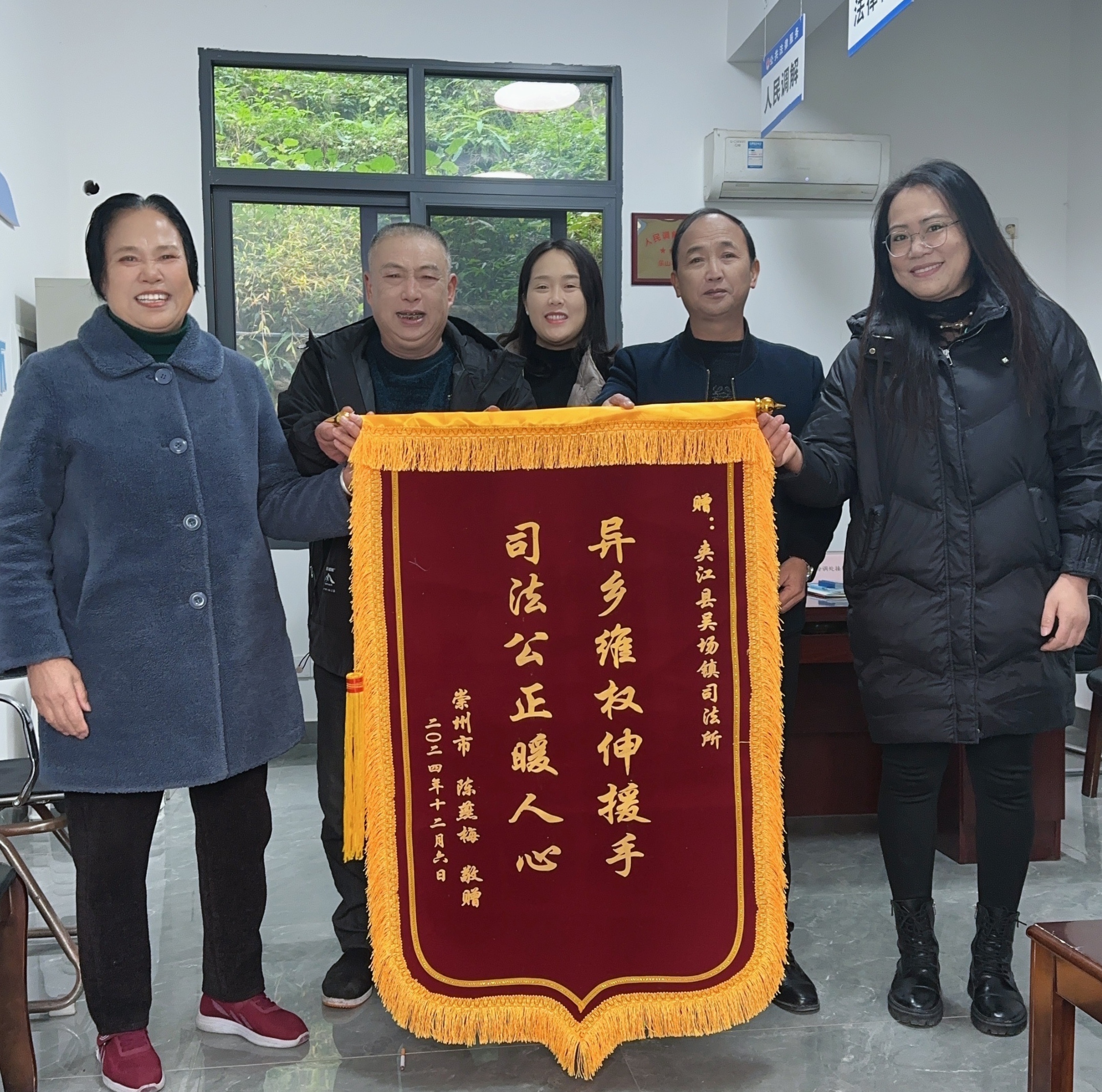 近日,一面写着“异乡维权伸援手 司法公正暖人心”的锦旗从陈女士送到夹江县吴场司法所,表达对人民调解工作的充分肯定,也对调解员的辛勤付出和高效调解表示衷心感谢。图片附件