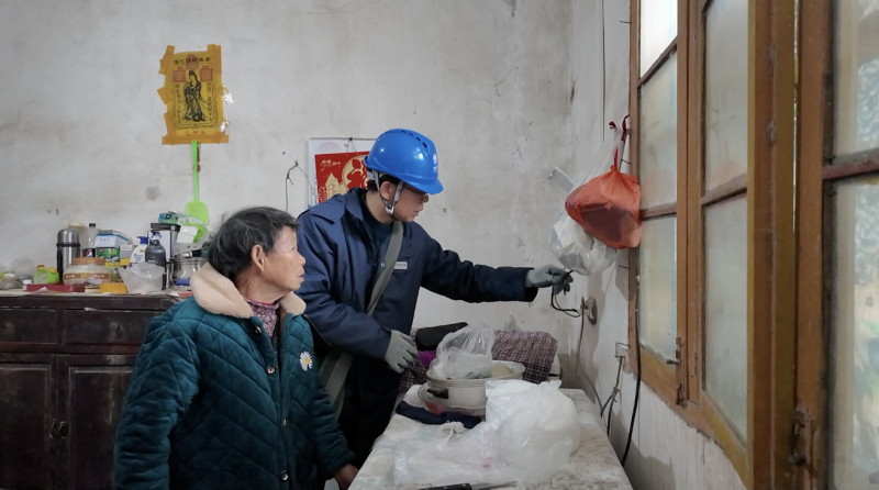 走访过程中,每到一户,工作人员都对房屋内的开关、插座进行细致入微地检查,并对老化的电线和损坏的插座进行更换,及时消除可能存在的用电安全隐患。考虑到老人的生活需求,供电所还贴心地为老人们送去生活必需品,并为老人留下了24小时服务热线。这一贴心举动,让老人们在寒冬中感受到了浓浓的暖意,面对供电人员的贴心服务,曹店村村民张发蓝满是感激:“供电所的工作人员来我家把电表、漏电保护器、电灯泡都给我弄好了,还给我送了米和油,我可以过个安稳年了。”
