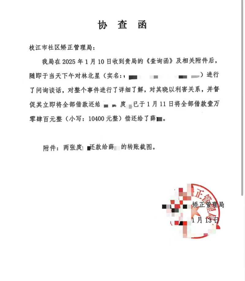 借款发生后,薛某多次要求林某还钱均无果,又因其做手术急用钱,才向司法所报告了此事寻求帮助!并强调林某目前也是一名正在服缓刑的人员,不过执行地是在湖南省某县,顾家店司法所第一时间就联系了湖南省某县社区矫正管理局,随后在顾家店司法所工作人员的协调、落实下,事情于2025年1月11日得以圆满解决。