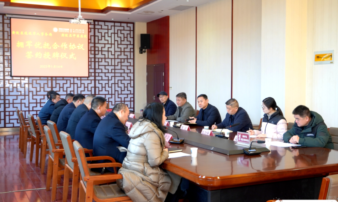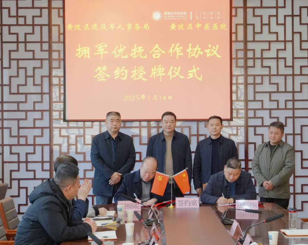 1月14日上午,黄陂区退役军人事务局与黄陂区中医医院在医院举行拥军优抚合作协议签约仪式,区中医医院将通过建立绿色通道,在挂号、诊疗、高效急诊、住院等多方面提供精准的医疗健康服务,为军人、退役军人和其他优抚对象健康保驾护航。