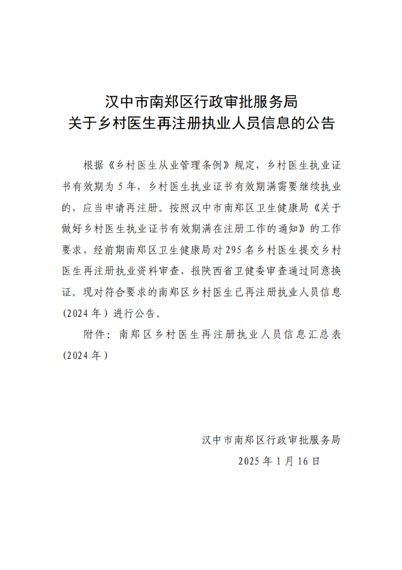 汉中市南郑区行政审批服务局关于乡村医生再注册执业人员信息的公告