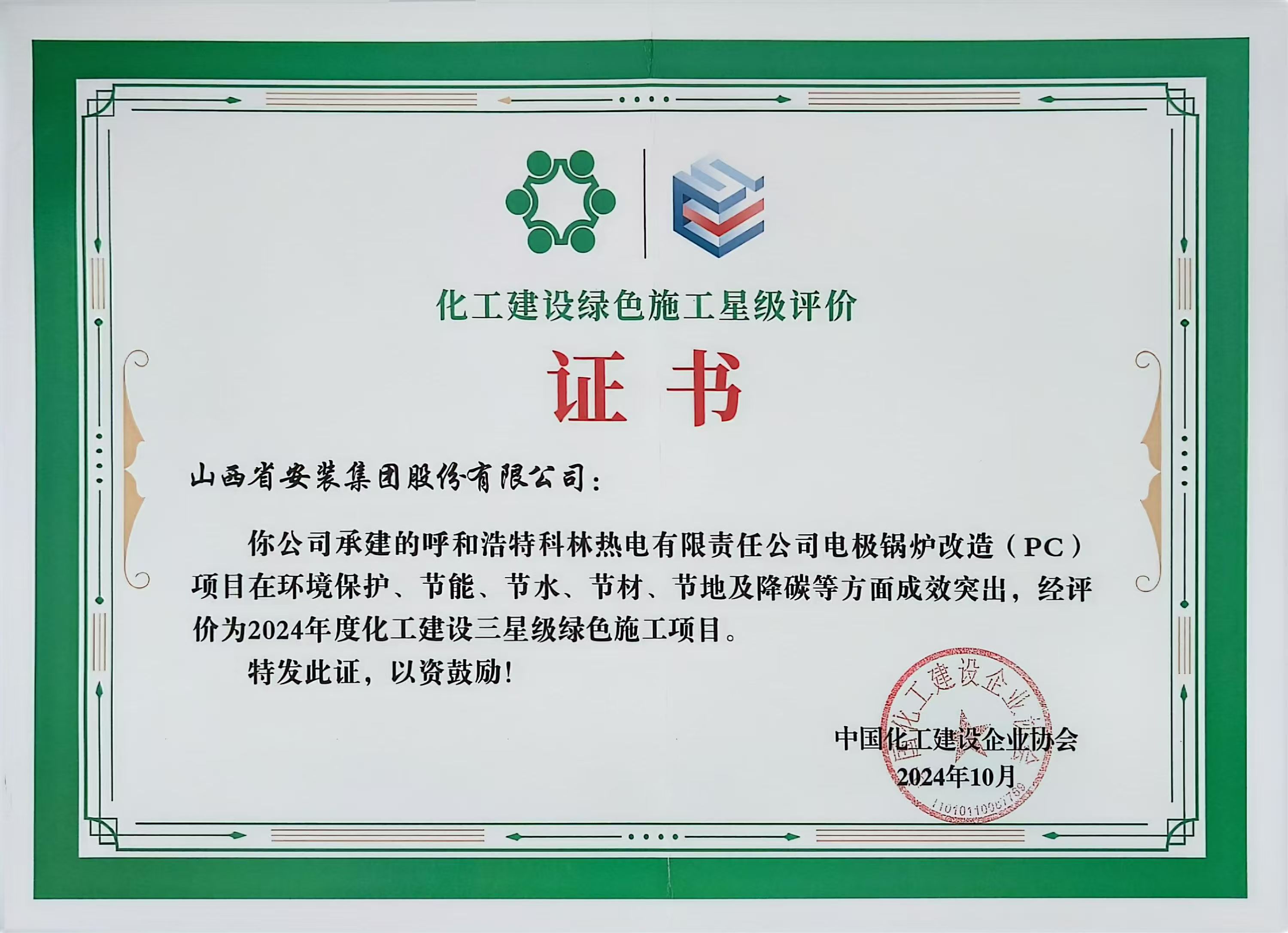 雄安工程公司华能呼和浩特科林热电电极锅炉调峰项目被评为2024年度化工建设三星级绿色施工项目